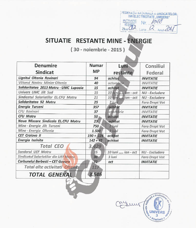 Sindicatul Mine Energie Oltenia(SMEO) cu 1500 de membri a fost lăsat, astfel, fără drept de vot la congresul de la Piatra Neamţ pentru că nu şi-a achitat cotizaţia către Univers pe ultimele două luni, într-o situaţie similară fiind şi Sindicatul Mine Energie Jilţ-Turceni, cu 750 de membri. Mai exact, Căldăruşe şi echipa sa, dar şi Marciuc cu ai lui nu pot vota, în aceste zile, la Piatra Neamţ pe motiv de neachitare a debitelor în cauză către Federaţie. Ambii nu pot decide preşedintele Federaţiei şi nici structura de conducere a Univers. Solidaritatea 92 Motru, cu doar 25 de membri, are aceeaşi problemă, mult mai lesne de înţeles raportat la numărul de sindicalişti deţinuţi de organizaţie. Sindicatul Salariaţilor din UEF Motru a fost, de asemenea, lăsat fără drept de vot la Consiliul Federal, pe motiv de neplată a cotizaţiei pe ultimele trei luni în timp ce Sindicatul Sondorul, lăsat intenţionat fără cotizaţie oprită de ştat de către Ilie Petrescu, riscă excluderea din Univers.