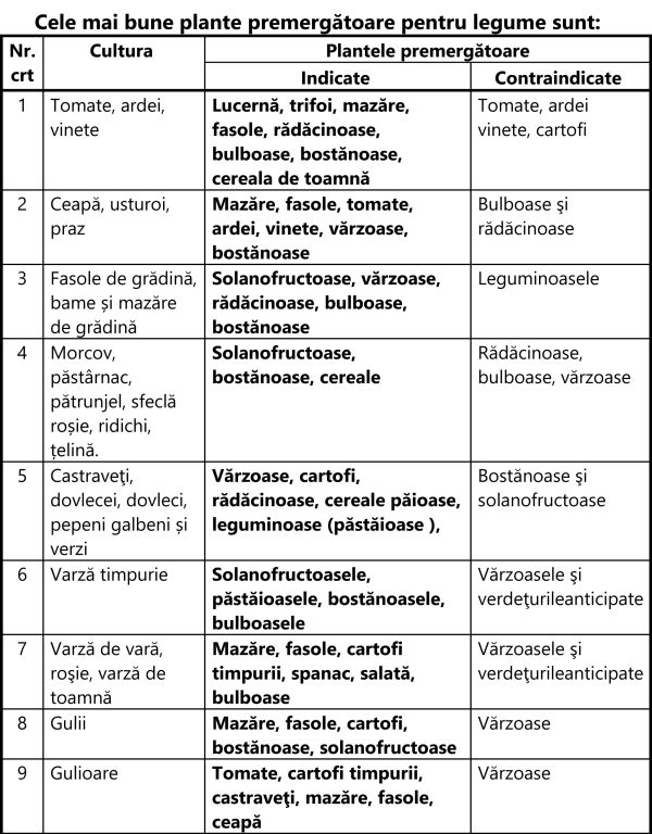 În cultura plantelor, deci și a legumelor, un factor foarte important în obținerea de recolte bogate și mai ieftine îl constituie planta premergătoare. Ea poate fi o puternică sursă de boli, buruieni sau dăunători,