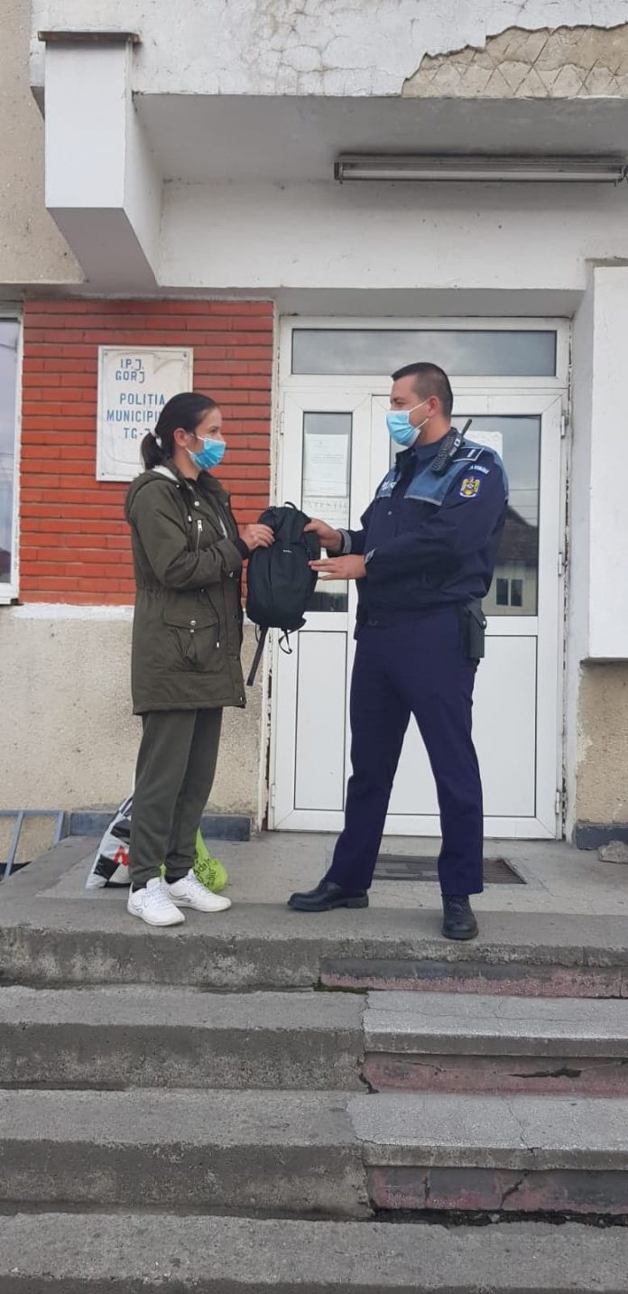 Astăzi, polițiști din cadrul Poliției Municipiului Târgu Jiu – Biroul Ordine Publica, aflându-se în exercitarea atribuțiilor de serviciu, au identificat, in zona stației de autobuz de pe bulevardul Unirii (Gârdu), un rucsac pierdut, iar în urma verificării au constatat că în interior se afla suma de 1.200 lei. Polițiștii au efectuat verificări și au identificat proprietara bunului, ca fiind o femeie de 33 de ani, care pierduse bagajul în acea zonă. Politiştii i-au înapoiat femeii rucsacul, împreună cu suma de 1.200.