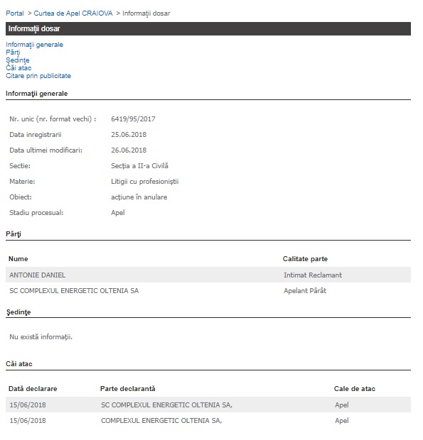 Juriștii Complexului Enegetic Oltenia au făcut pe 15 iunie apel în dosarul prin care Daniel Antonie își revendică locul în Directoratul companiei. Deși, Antonie a reușit, la Tribunalul Gorj, să anuleze hotărârea din decembrie a Consiliului de Supraveghere al CEO, care îl scotea în afara acestui for de conducere, sentința de
