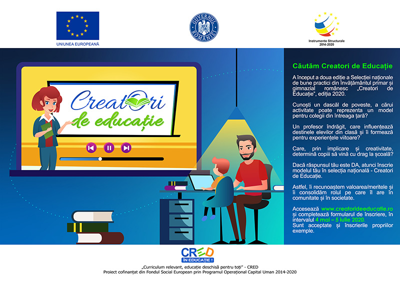 Învățătorii și profesorii din ciclul primar și gimnazial care au o contribuție remarcabilă la dezvoltarea competențelor-cheie ale elevilor au termen acum până la data de 5 iulie 2020 pentru a se înscrie la cea de-a doua ediție a Selecției Naționale de bune practici ,,Creatori de Educație”. Perioada de înscriere a fost prelungită pentru a oferi cât mai multor cadre didactice oportunitatea de a evidenția activitățile originale sau soluțiile inovatoare aplicate la clasă.
