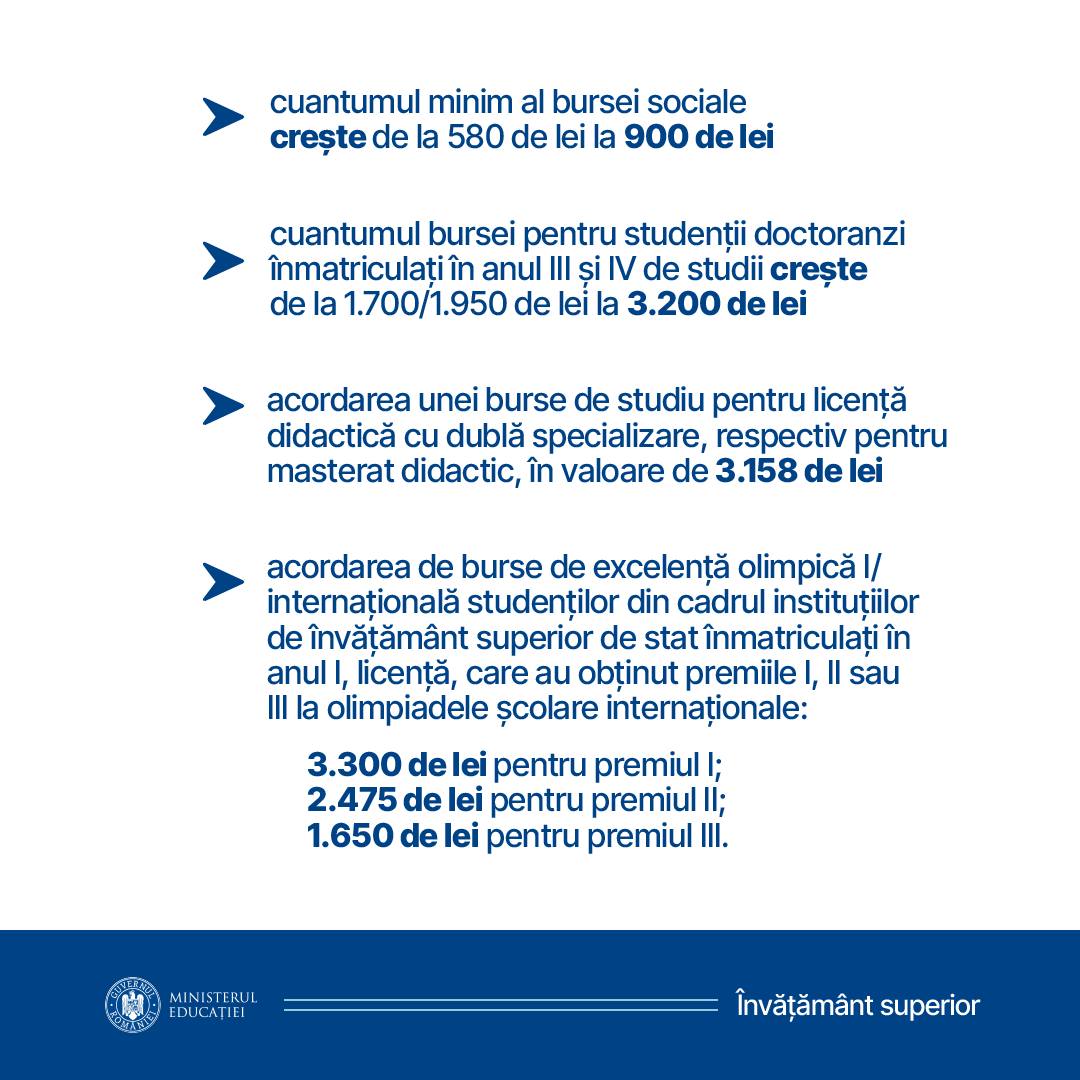 ”Precizăm că, pe lângă principalele modificări ce se găsesc în imagine, cuantumul burselor de performanță, bursa de performanță sportivă, bursa pentru învățământ dual și bursa specială vor fi stabilite prin hotărâre a senatului instituției de învățământ superior de stat, la propunerea Consiliului de administrație”, au anunțat reprezentanții Ministerului Educației.