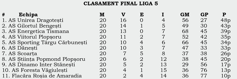 Ultimele meciuri programate în ligile a patra şi a cincea din Gorj s-au disputat la finalul săptămânii trecute. Jocurile nu au mai putut influenţa ierarhia finală în L4, unde CSO Turceni este campioană de o bună bucată de vreme. Petrolul Bustuchin a terminat pe doi, iar Jiul Rovinari pe trei, cele două formaţii oferind şi o întâlnire extrem de atractivă în runda cu numărul 24. Internaţional Băleşti a fost a patra echipă din play-off, într-un sezon inedit. Liga 5 a fost adjudecată de Unirea Dragoteşti, iar formaţiile din Bengeşti şi Tismana au completat podiumul. După ce învingătorii şi-au primit trofeele meritate, reprezentanţii AJF Gorj au premiat şi echipele care s-au clasat pe primele locuri în cele două ligi.