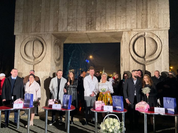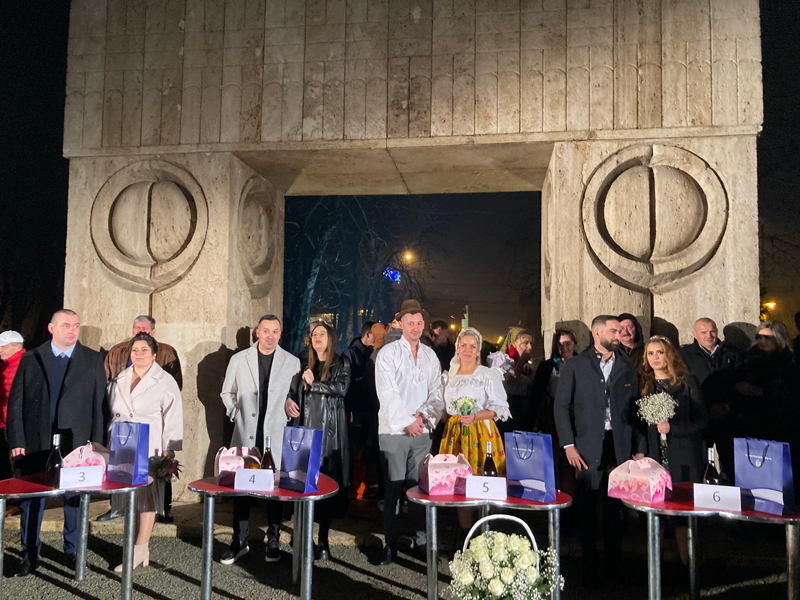 Este povestea de dragoste a doi tineri care în noaptea de Revelion au venit de la mii de kilometri depărtare pentru a se căsători la Târgu-Jiu. Ei formează unul dintre cele opt cupluri care au spus DA la Poarta Sărutului, în cadrul ceremoniei pe care primarul Marcel Romanescu a oficiat-o imediat după focul de artificii de pe Insuliță, la care au fost prezenți mii de oameni. Andrei și Maria Giura s-au cunoscut la Londra, deși el este gorjean la origini, iar ea e din Maramureș. Dragostea dintre ei a fost una la prima vedere, iar acum au decis să își unească destinele pentru totdeauna. Iar la ceremonia de la Poarta Sărutului au reușit să iasă în evidență și prin costumele tradiționale maramureșene pe care le-au îmbrăcat amândoi, dar și rudele miresei, care au venit aici pentru a-I fi alături. „Ne-am întâlnit la Londra și am decis să facem acest pas. Acolo ne-am cunoscut, iar acum iată-ne aici”, a spus mireasa, în timp ce mirele a menționat și el că încă de la începutul relației cu iubita sa a existat înțelegere și dragoste. „La Londra a pornit toată dragostea. Acolo ne-am întâlnit, ne-am înțeles de la început și am decis să facem acest pas pentru viitorul nostru”, a spus acesta. O rudă a miresei a menționat că în urmă cu câțiva ani un văr al acesteia a avut și el nunta la Poarta Sărutului, așa că neamurile din Maramureș nu au fost pentru prima dată la Târgu-Jiu. „Am mai făcut un Revelion la Târgu-Jiu acum câțiva ani. Un alt verișor s-a căsătorit tot aici în 2017. Și a fost cu noroc, are o familie frumoasă și fericită. Sper să dea Domnul să fie și acum la fel. Când ea mi-a spus că se căsătorește aici m-am bucurat enorm și sper să aibă o familie fericită și ea”, a declarat ruda miresei. La Poarta Sărutului a fost și un cuplu din Timișoara care, în urmă cu o lună, a luat decizia de a-și uni destinele la cumpăna dintre ani, la Târgu-Jiu. Mario și Ionela Telehoi nu au rude sau prieteni prin Gorj, dar aici au decis să facă cel mai important pas din viața lor. „Nu știm pe nimeni pe aici, nu am fost niciodată pe aceste locuri, dar acum o lună discutam cu soția mea și am zis ce-ar fi să ne căsătorim aici. Am vrut să marcăm într-un fel anume relația noastră de iubire și iată-ne aici. Ne bucurăm foarte mult, ne-a plăcut totul și, astfel, rămânem cu un moment de neuitat”, a explicat mirele. Pentru fiecare cuplu în parte municipalitatea a oferit un buchet de flori, un tort și o șampanie, după ceremonia de la Poarta Sărutului tinerii căsătoriți plecând la restaurante pentru a sărbători alături de rude și prieteni.