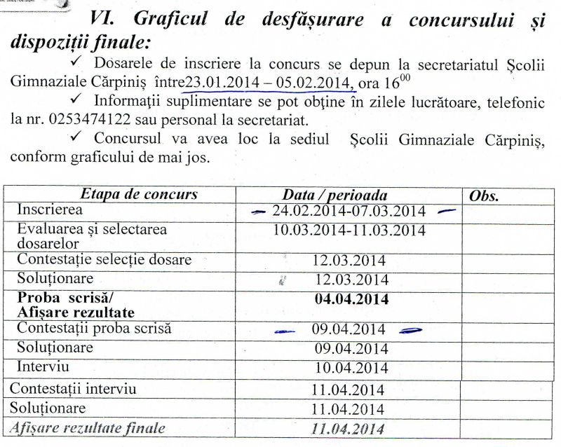 Concursul pentru postul de secretar-şef la Şcoala Gimnazială Cărpiniş, din comuna Crasna, a fost anunţat în luna februarie, dar cu erori intenţionate pentru a induce în eroare potenţialii candidaţi pe funcţie. Astfel, în anunţul publicat pe site-ul şcolii apare redactat în exteriorul graficului că dosarele se depun în perioada 23.01.2014-5.02.2014 ca în grafic datele să fie total schimbate. Mai precis este trecută data corectă de depunere, 24.02.2014-7.03.2014. În partea de jos a anunţului, în afara graficului, apare a doua eroare, legată de depunerea contestaţiilor, care conform datelor trecute aici se pot face în termen de 48 de ore de la afişarea rezultatelor, iar în grafic apare data de 9.04.2014.