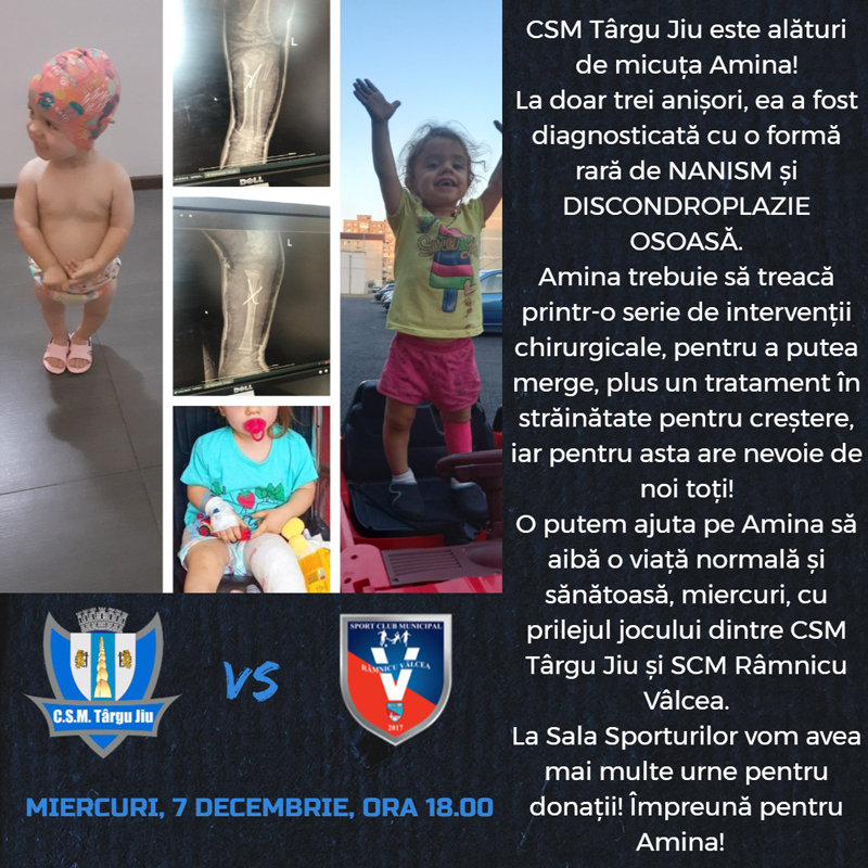 Clubul Sportiv Municipal Târgu Jiu s-a implicat și într-o campanie de ajutorare a micuței Amina. La doar trei anișori, ea a fost diagnosticată cu o formă rară de NANISM și DISCONDROPLAZIE OSOASĂ. Fetița trebuie să treacă printr-o serie de intervenții chirurgicale, pentru a putea merge, plus un tratament în străinătate pentru creștere. Spectatorii prezenți la partida de miercuri, care vor s-o ajute pe Amina să aibă o viață normală și sănătoasă, au prilejul să doneze orice sumă. Ei pot achiziționa și decorații de Crăciun hand-made, făcute de mama micuței.