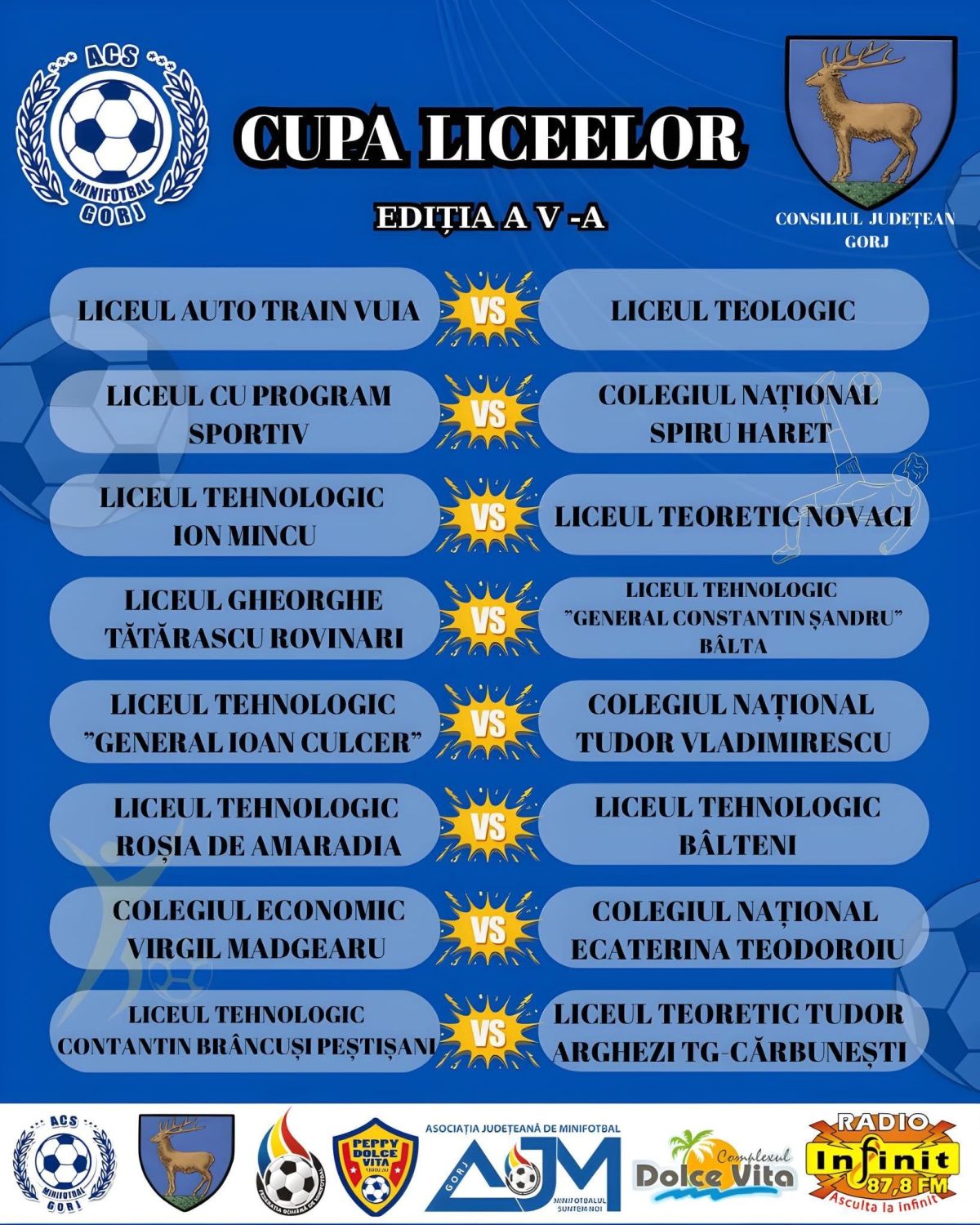 În urma tragerii la sorți desfășurate miercuri, 8 octombrie 2025, de la ora 17:00, în cadrul Complexului Dolce Vita Târgu Jiu, au fost stabilite meciurile din optimiile de finală ale Cupei Liceelor, ediția a 5-a. Competiția este organizată cu sprijinul Consiliului Județean Gorj, printr-un proiect cofinanțat din bugetul județului Gorj pe anul 2025 și se desfășoară la Complexul Dolce Vita Târgu Jiu. Întrecerea este rezervată tinerilor sportivi din ciclul liceal de învățământ (născuți după 1 ianuarie 2006).
