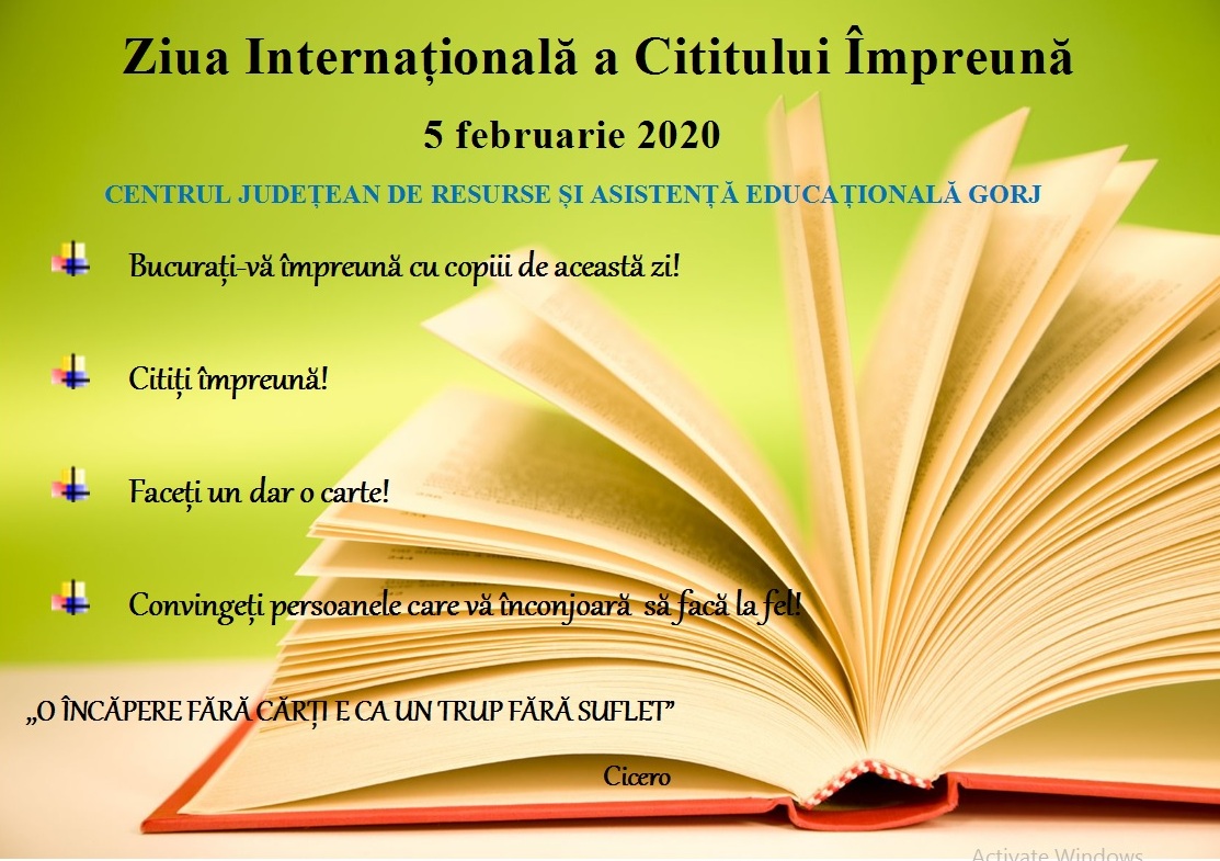 Pentru a sărbători bucuria lecturii împreună, CJRAE Gorj s-a alăturat inițiativei „Citim Împreună România”, punând la dispoziția profesorilor consilieri școlari un pachet de resurse educaționale ce conține sugestii de exerciții/jocuri pentru fiecare dintre momentele unei activități de consiliere de grup, precum și activități care presupun exersarea comportamentului de a citi împreună cu familia, colegii sau prietenii.