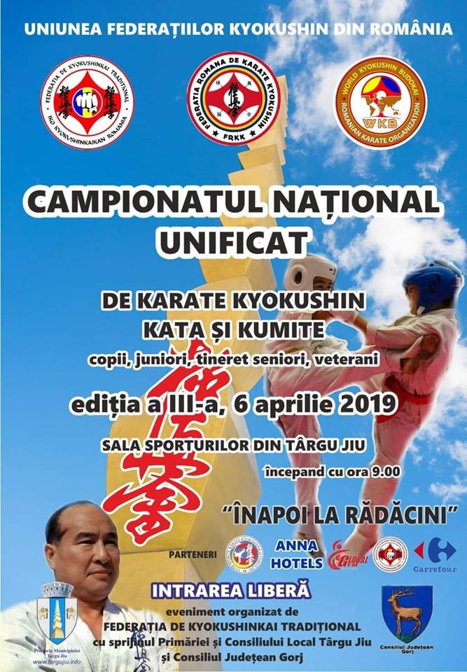 În data de 6 aprilie 2019, între orele 09.00-19.00, are loc la Sala Sporturilor din Târgu-Jiu, cea de a treia ediţie a Campionatului Național Unificat de Karate Kyokushinkai, pentru Copii, Juniori, Tineret şi Seniori, eveniment din Calendarul Competițional pe anul 2019 al Federatiei de Kyokushinkai Tradiţional din România şi al Uniunii Naţionale a Federaţiilor de Karate Kyokushin din România.