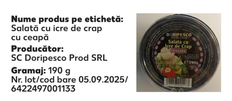 Conform anunțului public, este vorba despre trei produse: Salată cu icre de crap cu ceapă (130 g, cod de bare 6422497001119), Salată de icre Doripesco cu ceapă (100 g, cod de bare 6422497002208) și Salată de icre de crap (190 g, cod de bare 6422497001133), toate fabricate în data de 5 septembrie 2025 și având termenul de valabilitate 20 octombrie 2025.