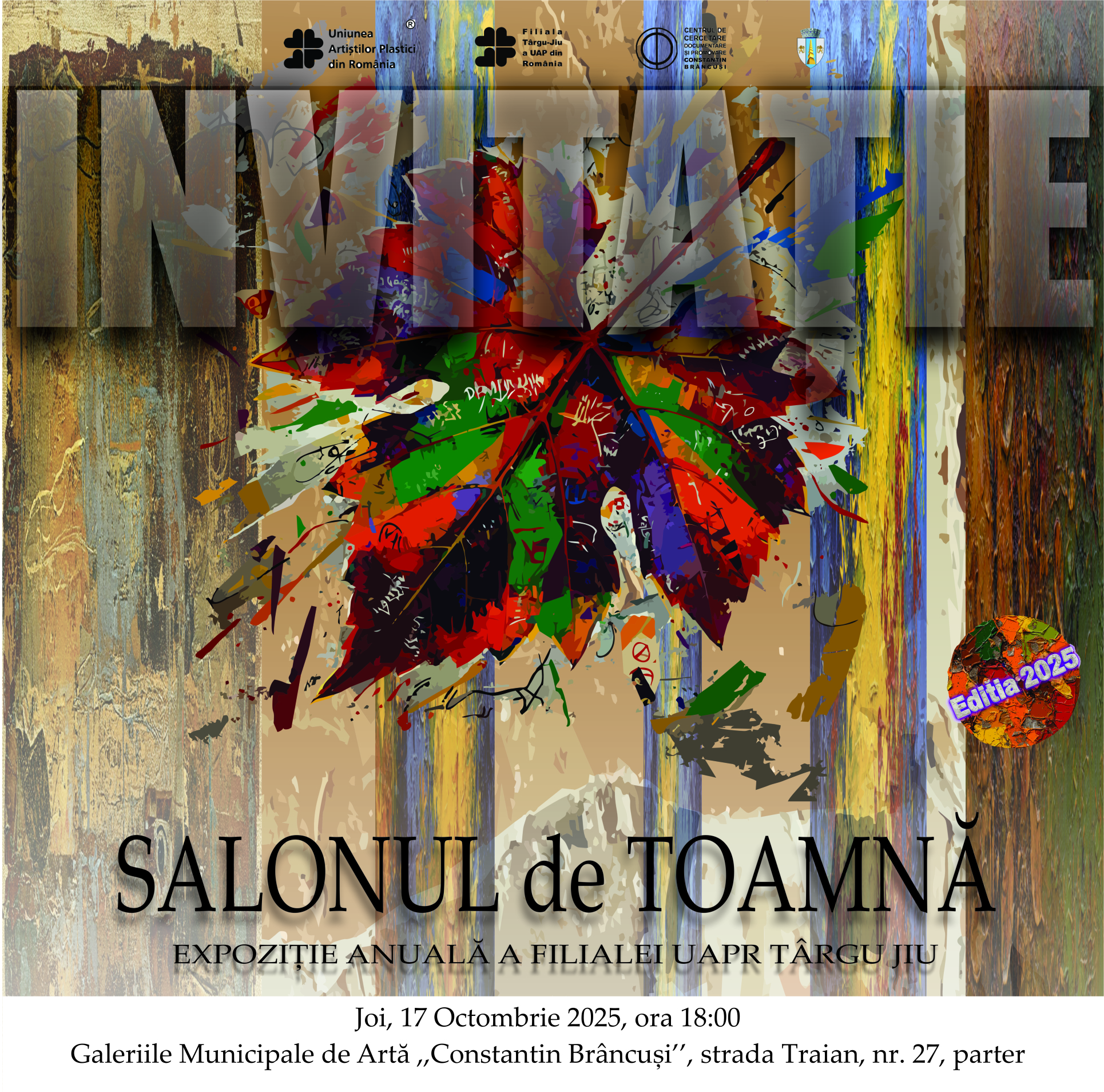 Filiala Târgu Jiu a Uniunii Artiștilor Plastici (UAP) din România, în parteneriat cu Centrul de Cercetare, Documentare și Promovare „Constantin Brâncuși”, organizează mâine, 16 octombrie a.c., începând cu ora 17:00, vernisajul expoziției de arte vizuale „Salonul de Toamnă”, ajunsă la ediția cu numărul XXIX.