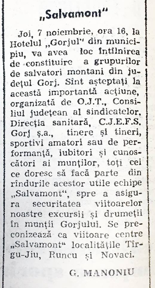 În toţi aceşti ani, cotidianul „Gorjeanul” a fost alături de salvamontiştii gorjeni reflectând, în imagini şi articole realizate, rezultatele deosebite obţinute într-o cronologie aproape corectă de către: George Manoniu, Ion Elena, Călin Ninica, Nicolae Brânzan, Paul Plopa, Gheorghe Ceauşescu, Ion Şoldea, Mugurel Petrescu, Dorin Brozbă, Marius Becherete, Nicolae Giorgi şi, în ultimii ani, Izabella Molnar şi Minodora Sucea.