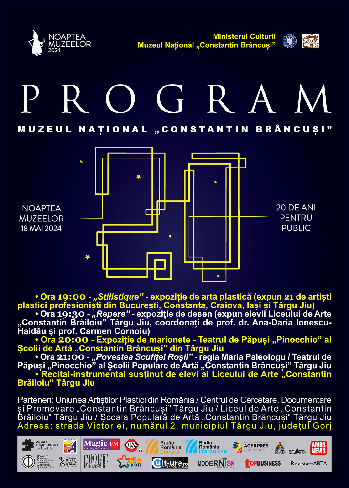 – Ora 20:00 – Expoziție de marionete – Teatrul de Păpuși „Pinocchio” al Școlii de Arte ”Constantin Brâncuși” din Târgu Jiu