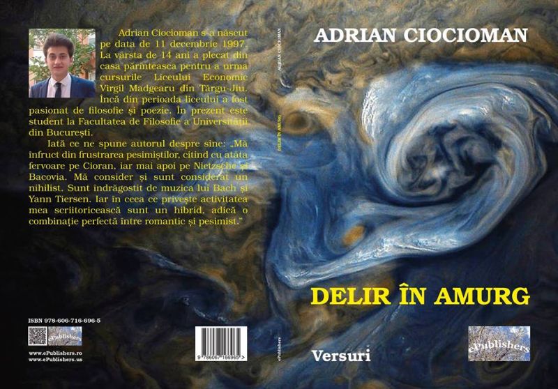 Născut la Prigoria şi şcolindu-se la Târgu-Jiu şi, ulterior, la Bucureşti, tânărul Adrian Ciocioman va păşi, sâmbătă, în rândul poeţilor. El îşi va lansa volumul de debut intitulat “Delir în amurg”. “Sper ca odată cu acest volum să ajung în inimile gorjenilor şi ale românilor iubitori de poezie. Am 19 ani şi provin din comuna Prigoria. Am studiat Şcoala Generală Prigoria, acesta fiind locul unde m-am format şi şcoala unde am întâlnit profesori extraordinari, apoi am mers la Colegiul Economic “Virgil Madgearu” din Târgu-Jiu. Acum locuiesc în Bucureşti şi sunt student în anul II la Facultatea de Filosofie a Universităţii din Bucureşti. Am ales să studiez această facultate pentru a cunoaşte şi a mă cunoaşte. La această alegere a mai contribuit şi veşnica mea răsmeliţă cu Biserica şi religia. Am urmat cursurile acestei facultăţi dintr-o plăcere nebună de a specula, am mers la Facultatea de Filosofie din pasiune, iar ea reprezintă pentru mine un scop în sine, nu un mijloc. Volumul care va apărea la Gaudeamus este un volum de poezii (versuri), este o mărturie a tuturor paroxismelor trăite în acest an în care am lucrat la acest volum. Sincer, publicarea acestui volum reprezintă, pentru mine, un eroism având în vedere că am mai avut şi alte scrieri pe care am vrut să le public, dar au sfârşit pierdute, adică la gunoi. Nu o să dau mai multe detalii despre ceea ce o să găsiţi în acest volum; vă las să descoperiţi, nu are rost acum să ştirbesc din poezii. Un sentiment nu se poate explica, ci doar descrie. Aşa cum se regăseşte şi pe coperta a patra a cărţii, am fost foarte influenţat de operele lui Nietzsche şi Cioran, în special de autorii pesimişti pe care i-am citit. Însă am fost foarte pasionat şi de filosofia greacă şi de filosofia politică. Nu am nicio aşteptare specială de la această carte şi nu e vorba de modestie şi nici de autocritică. Ar fi o naivitate dacă m-aş aştepta să devin celebru peste noapte. Nu am de ce să am aşteptări; e o simplă carte de poezii. În tot acest demers al meu, nu mă susţine nimeni în afară de echipa de la ePublishers, cei care mi-au dat marea şansă, la ei am apelat prima dată. În legătură cu viitorul, ştiu clar că voi continua cursurile Facultăţii de Filozofie, însă, în rest, nu ştiu, nu vreau să mă pronunţ. În prezent, lucrez tot la un volum de poezii care, probabil, va apărea în toamna anului viitor”, a declarat, în exclusivitate pentru Cotidianul Gorjeanul, tânărul poet Adrian Ciocioman.