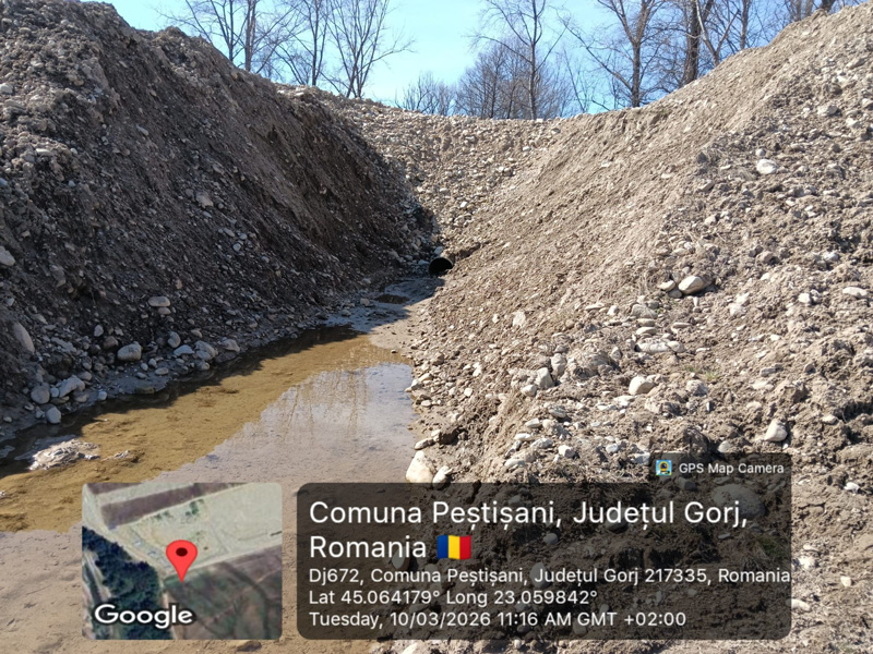 În urma unui control efectuat în data de 10.03.2026, inspectorii Apele Române Jiu au constatat că o societate comercială de pe raza UAT Peștișani a executat un canal pentru dirijarea apelor provenite din perimetrul de exploatare a agregatelor minerale, fără a solicita și obține în prealabil actele de reglementare necesare.