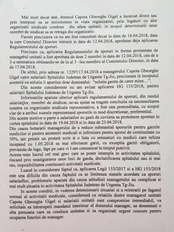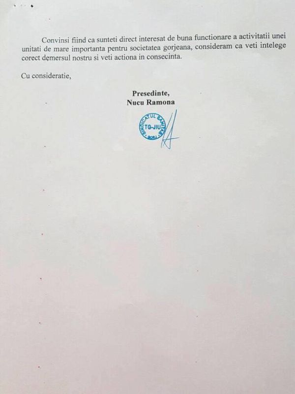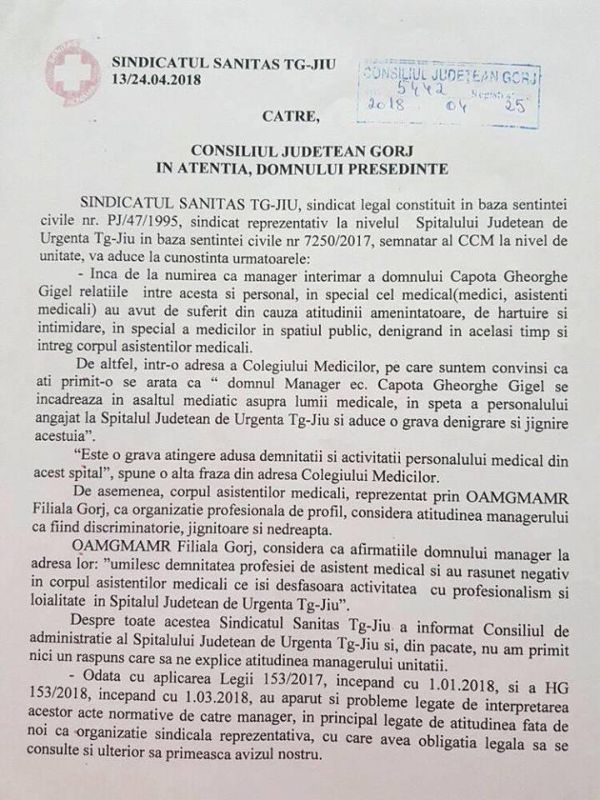 Astăzi, a fost înregistrată la Consiliul Judeţean Gorj o adresă semnată de Sindicatul SANITAS Târgu-Jiu, prin intermediul căreia se prezintă o serie de probleme