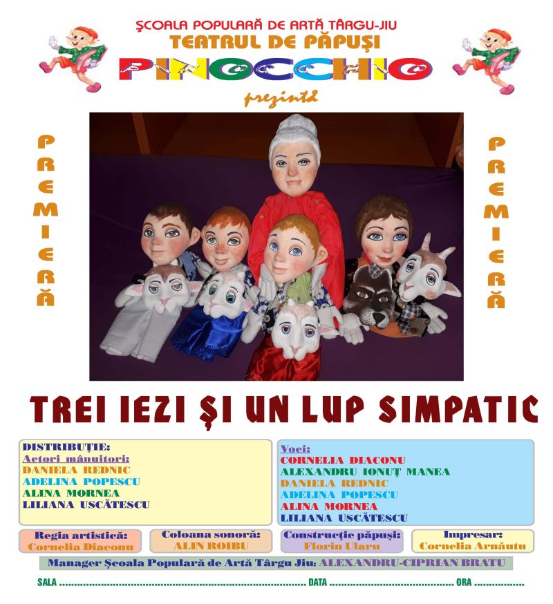 Teatrul de Păpuși „Pinocchio”, din cadrul Școlii Populare de Artă Târgu- Jiu, vă invită joi, 11 aprilie, ora 12.00, la Muzeul Județean „Alexandru Ștefulescu”, la premiera spectacolului „Trei iezi și un lup simpatic”, o poveste rescrisă și dramatizată de actrița Cornelia Diaconu, după cunoscuta poveste ,,Capra cu trei iezi”, de Ion Creangă. Din distribuție fac parte actorii păpușari: Daniela Rednic, Adelina Popescu, Alina Mornea și Liliana Uscătescu. ,,Pentru a capta atenția copiilor născuți și crescuți mai mult într-o lume virtuală, eu am încercat (și sper că am și reușit) să-i implic în poveste. Le-am dat posibilitatea să participe. Păpușile-copii se pot tranforma în personaje de poveste și reinventa acțiunea”, a declarat actrița Cornelia Diaconu. Spectacolul este unul energic; din piesă nu vor lipsi dansurile și cântecelele. Copiii vor merge alături de actori într-o călătorie plină de peripeții și vor învăța cât de important este să-ți asculți părinții. Intrarea este liberă!