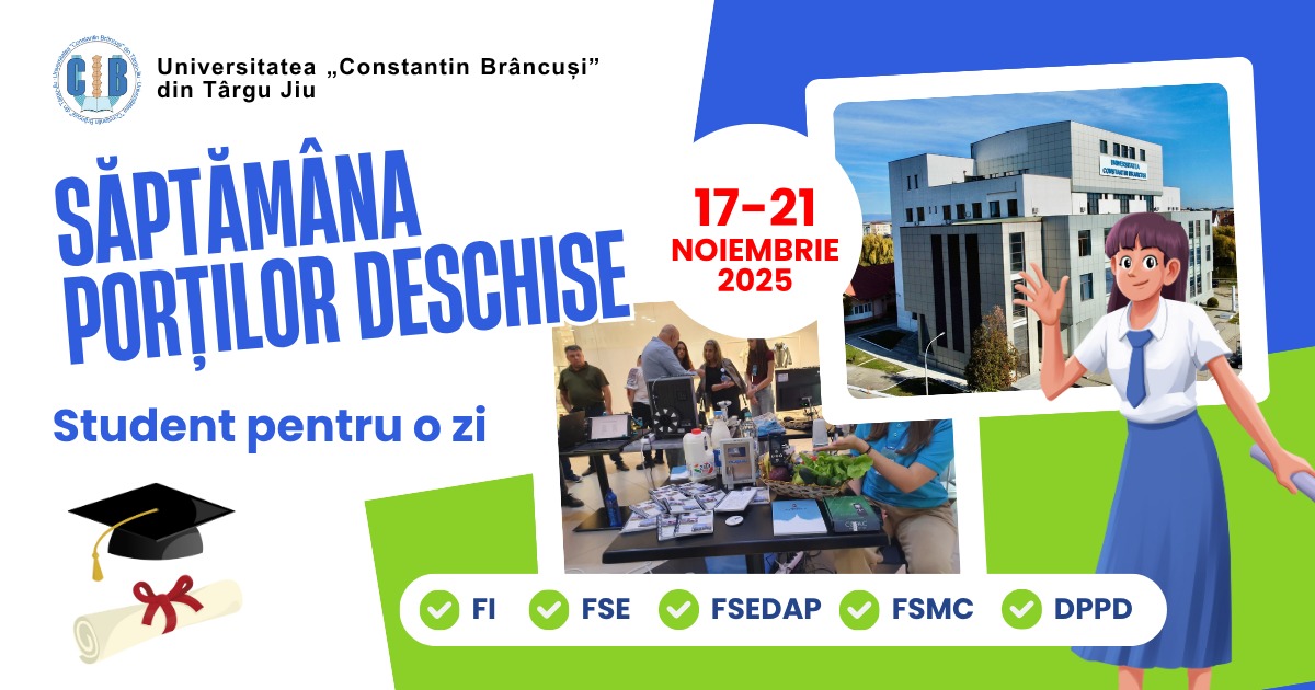 Universitatea „Constantin Brâncuși” din Târgu Jiu organizează, în perioada 17-21 noiembrie 2025, Săptămâna porților deschise, un eveniment dedicat elevilor de liceu care doresc să afle mai multe despre viața academică și oportunitățile de studiu oferite de instituție.
