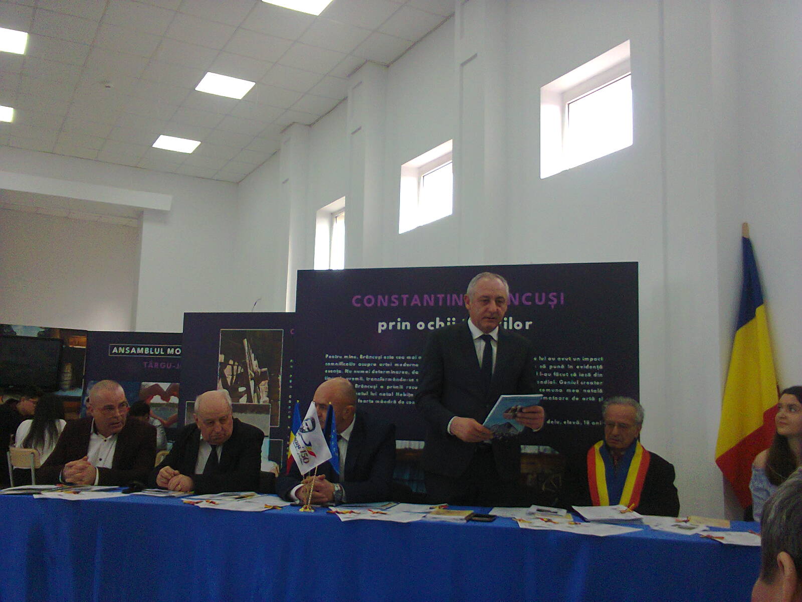 azi, iar, eu am venit cu conducerea Asociaţei care aduce în atenţie pentru noi, pe cei care au luptat pentru libertatea ţării. Dincolo de faptul că are cei mai mulţi generali, Gorjul este eroic, cu eroi care au luptat din vremuri depărtate, din vremea lui Burebista, până în 1918, când s-au unit provinciile româneşti. Iată că ajungem să ne prezinte în lume cu numele său marele sculptor al omenirii, Constantin Brâncuşi. El a început o mare istorie a artei româneşti şi chiar a spus că odată cu opera lui începe o istorie nouă în întreaga lume! ,,Cocoşul sunt eu”, spunea Brâncuşi, pentru că voia să trezească societatea la o viaţă nouă”! În continuare, domnia sa a insistat asupra ideii că sunt mulţi savanţi în lume care recunosc faptul că România este ţara lui Brâncuşi, că Peştişani şi Hobiţa sunt meleaguri pe care talpa lui le-a cucerit încă din copilărie. Dar, el nu este încă bine cunoscut, pentru că abia încheiem o etapă de cunoaştere, ca număr, a tuturor operelor lui, vreo 720 de lucrări, iar, el este şi va rămâne inovatorul, nu numai în arta plastică propriu-zisă, pictură şi sculptură, dar, şi în desen, pentru că fiecare operă a realizat-o mai întâi sub formă de desen, inclusiv în culori. E un mare desenator în arta lumii, despre care nu se prea vorbeşte, a insistat vorbitorul!