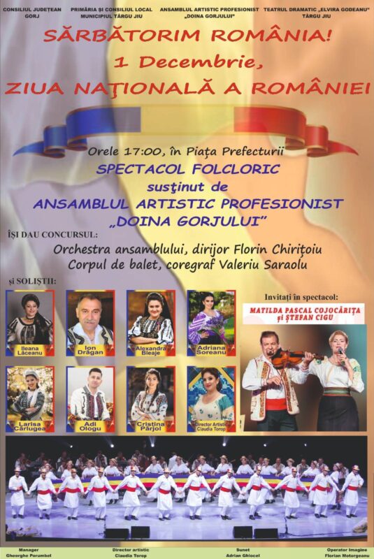 Municipiul Târgu Jiu marchează Ziua Națională a României printr-o serie de evenimente organizate în Piața Prefecturii, sub titlul „Sărbătorim România!”. Manifestările vor începe la ora 17:00, cu un program folcloric susținut de Ansamblul Artistic Profesionist „Doina Gorjului”, care va aduce publicului cântece și dansuri tradiționale.