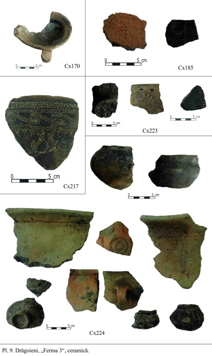 Din punct de vedere al formelor, se disting vasele de „tip urnă”, de dimensiuni reduse, cu gâtul tronconic și corpul combat, trecerea dintre cele două făcându-se printr-un umăr mai puțin proeminent. Buza era răsfrântă spre exterior și fațetată în unele cazuri. Între descoperirile noastre avem vase simple, nedecorate, iar altele care prezintă pe umăr un decor compus din caneluri orizontale sau din așa numitul „șnur fals” (benzi de linii paralele crestate oblic), dispus oblic sau în ghirlandă. Acest ultim ornament apare într-un singur caz și la baza gâtului unui vas din categoria mai sus menționată. Din acest sit, cele mai numeroase vase ale ceramicii fine și semifine sunt străchinile cu corpul probabil tronconic sau arcuit și buza puțin îngroșată, întoarsă ușor spre interior. În rândul acestora se remarcă un fragment bine lustruit pe ambele părți și un altul, decorat cu două rânduri de „șnur fals”, dispus orizontal, pe exteriorul buzei .
