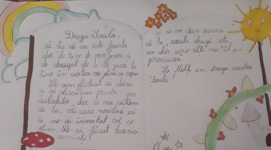 Așa cum au putut și au simțit ei, cu priceperea și talentul lor, prin compuneri poezie sau desen, elevii clasei a V-a C au transmis cu această ocazie mesaje pline de emoție în care au mărturisit cu sufletul lor sincer și curat cât de dor le este de școala lor, cât de mult își apreciază și își iubesc profesorii, cât de mult își doresc să se întoarcă la școală, în „curtea cu glasuri zgomotoase„, în băncile lor cu amintiri, să-și revadă colegii și cadrele didactice.