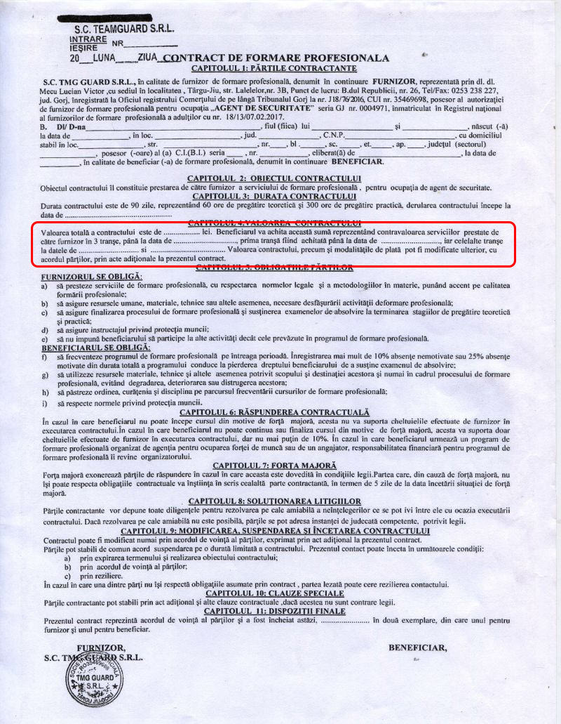 Cinci salariați, la sfatul liderului lor sindical, au semnat contractele, chiar dacă la capitolul patru beneficiarii se obligau să plătească firmei TMG GUARD SRL școlarizarea în meseria de “agent de securitate”, în trei tranșe.