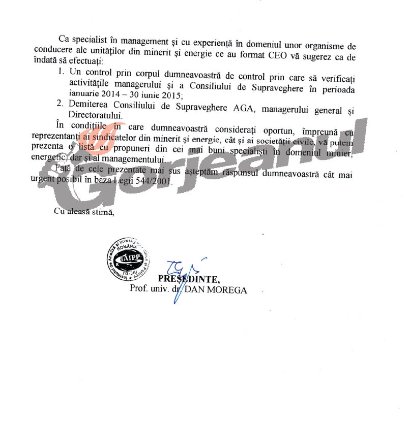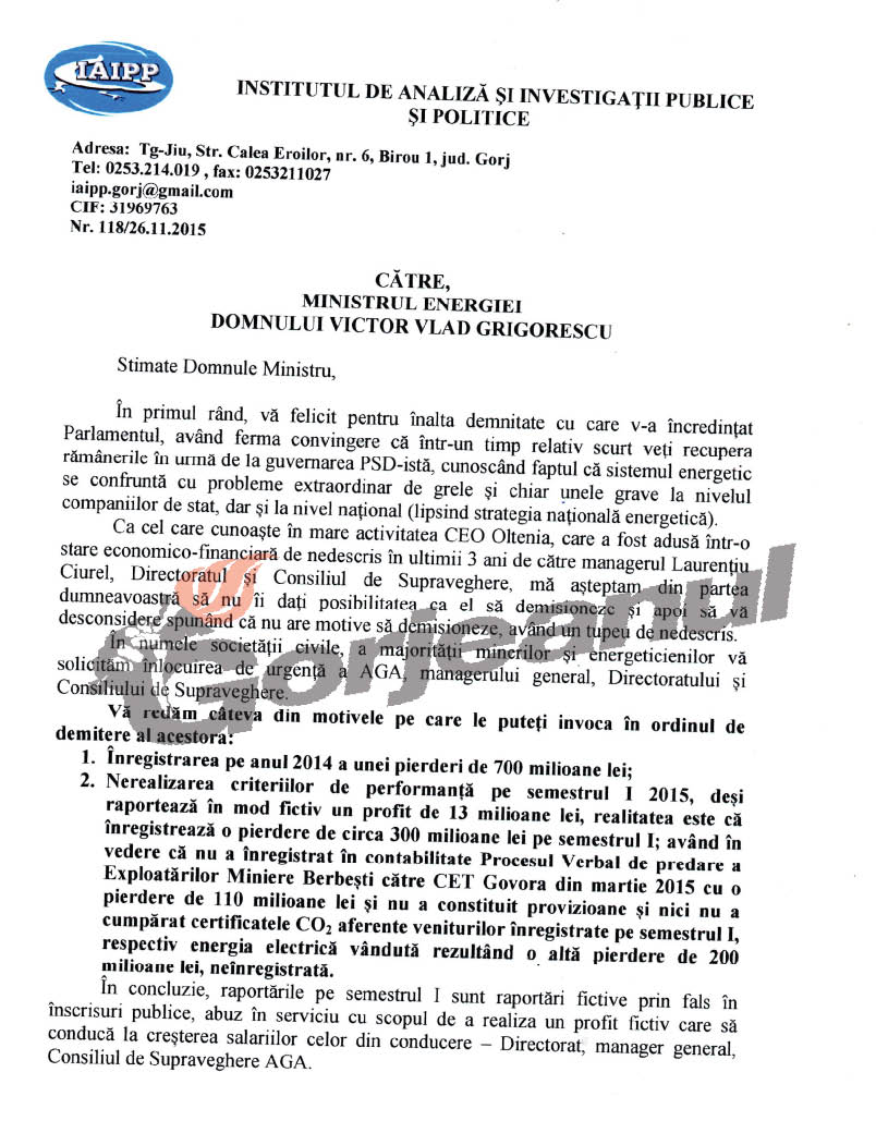 La sfârşitul lunii noiembrie, Institutul de Analiză şi Investigaţii Publice şi Politice(IAIPP), condus de Dan Ilie Morega, iniţia o corespondenţă cu noul ministru al Energiei, Victor Grigorescu. În numele IAIPP, dar şi al minerilor şi energeticienilor, Morega îi atrăgea atenţia ministrului legat de problemele cu care se confruntă Complexul Energetic Oltenia(CEO), condus de Laurenţiu Ciurel, solicitând demiterea managerului general dar şi schimbări importante în Consiliul de Supraveghere(CS) şi în Directoratul CEO. Tot expeditorul scrisorii îi transmitea lui Grigorescu şi câteva motive care ar putea sta la baza demiterii lui Ciurel, principala fiind cea a pierderii de 700 de milioane de lei, înregistrată de companie în 2014. În cuprinsul scrisorii, ministrul era avertizat şi în legătură cu anumite raportări în fals, pe primul semestru al acestui an, cu scopul realizării unui profit fictiv care, spunea Morega, nu ar fi făcut decât să conducă la creşterea salariilor celor din conducerea societăţii, pornind de la managerul general, şi trecând pe la membrii Directoratului şi pe la cei ai CS.
