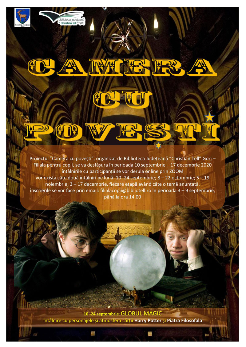 Proiectul ,,Camera cu Povești” 2020 se va desfășura în perioada septembrie – decembrie 2020; în fiecare din cele patru luni vor fi organizate câte două întâlniri cu participanții, în zilele de 10 și 24 septembrie, 8 și 22 octombrie, 5 și 19 noiembrie, respectiv 3 și 17 decembrie. Fiecare întâlnire va avea câte o temă diferită, anunțată în prealabil. Pe 10 septembrie, de exemplu, copiii se vor întâlni cu personajele și atmosfera cărții ,,Harry Potter și Piatra Filosofală”, pentru această întâlnire ei trebuind să citească capitolul II din volumul menționat. ,,Înscrierile la proiect se vor face pe adresa de e-mail filialacopii@bibliotell.ro, în perioada 3 – 9 septembrie 2020, până la ora 14.00. Activitățile se vor desfășura online pe platforma ZOOM, pe care puteți intra accesând link-ul primit pe adresa de e-mail. La fiecare activitate interactivă se primesc puncte. La finalul proiectului, în luna decembrie, în funcție de punctajul obținut, veți primii diplome și alte surprize”, au anunțat reprezentanții bibliotecii.