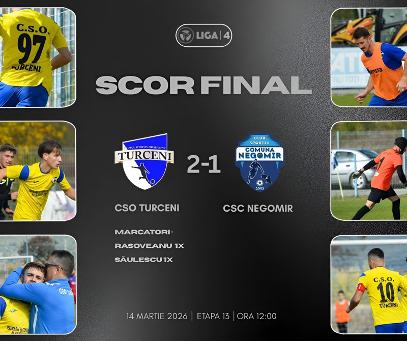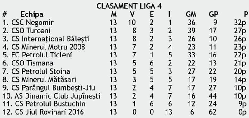 CSC Negomir pierde din turație în 2026. După o remiză în runda precedentă, liderul din Liga a patra gorjeană a fost învins de CSO Turceni cu 2-1. De altfel, gazdele au devenit principala urmăritoare a vicecampioanei din sezonul trecut, fiind acum la 5 puncte distanță. Bălești completează podiumul la un singur punct de locul doi, după ce Internațional a făcut scorul rundei cu Jupînești.