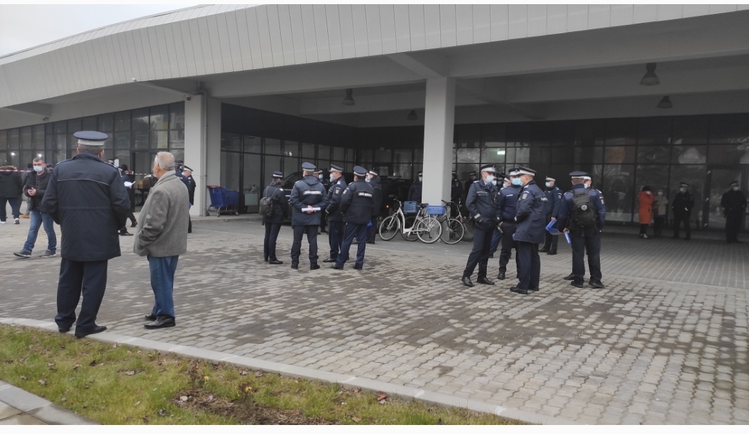 Președinții de secții de votare din Gorj așteaptă la stadionul din municipiul Târgu-Jiu să ridice buletinele de vot, ștampilele și materialele electorale. Alături de președinți sunt numeroși jandarmi care asigura paza transporturilor spre secțiile de votare.