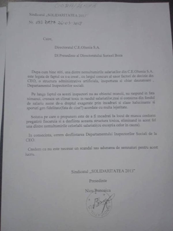 Sorin Boza, managerul Complexului Energetic Oltenia, a primit, luni, o adresă din partea Sindicatului Solidaritatea 2013 de la Cariera Lupoaia în care i se solicită o serie de măsuri ce trebuie aplicate în companie pentru a evita nemulțumirile de genul celor care au ținut, miercuri, departe de muncă peste 500 de mineri. În cuprinsul adresei, lui Boza i s-a cerut o armonizare salarială corectă și transparentă, acordarea sporului de tură pentru cei care lucrează astfel chiar și pe perioade determinate, acordarea sporului de fidelitate raportat la clasa unu pentru toți salariații, dar și “desființarea departamentului de boieri sindicali”. În acest caz este vorba despre desființarea posturilor de inspectori pe protecția muncii, care sunt ocupate de opt lideri de sindicat din CEO.
