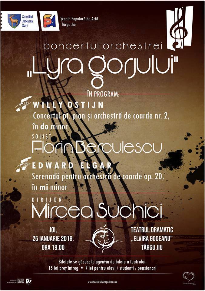 Primul concert din anul 2018 al orchestrei „Lira Gorjului” a oferit publicului meloman din Târgu-Jiu în atmosfera caldă a Sălii Teatrului „Elvira Godeanu” din seara zilei de 25 ianuarie 2018 un program conţinând lucrări aparţinând compozitorului belgian Willy Ostijn (1913-1993) şi compozitorului englez Sir Edward Elgar (1857-1934). Concertul se recomandă şi ca o premieră întrucât nu avem cunoştinţă asupra faptului dacă lucrarea compozitorului Willy Ostijn a fost interpretată până acum în România. Trebuie să apreciem cu această ocazie spiritul de cercetare care este reflectat în alcătuirea, pregătirea şi realizarea programelor muzicale şi care poartă amprenta domnilor Berculescu şi Suchici. Lucrările interpretate fac cinste şi generează interes pe oricare scenă de concert. Argumentele care susţin programul serii sunt numeroase. Un prim impediment în deschiderea publicului faţă de astfel de lucrări îl constituie însăşi biografia compozitorilor şi receptarea operei acestora care este o problemă comună multor compozitori şi personalităţi din istoria muzicii, artei şi nu numai, ştiinţa nu face excepţie de la aceasta. Iniţial doream să mă refer la cei doi compozitori respectând ordinea cronologică, mai întâi Elgar şi apoi Ostijn însă pe măsura desfăşurării concertului atmosfera şi dinamica muzicală a serii m-a determinat să mă refer la cele două lucrări în ordinea programului de concert. Lucrarea care a deschis programul de concert al serii a fost Conzertstück pentru pian şi orchestră de coarde în Do minor (1959) de Willy Ostijn (1913-1993). Acesta este un compozitor belgian de muzică clasică de factură romantică. Într-adevăr faptul că a trăit în secolul al 20-lea şi a compus muzică în stil romantic poate să pară puţin derutant pentru cei care asociază în mod superficial romantismul muzical imaginilor şi caricaturilor cu stilul flamboainat al lui Nicolò Paganini şi Franz Liszt sau cu romantismul lacrimogen ataşat nocturnelor lui Frédéric Chopin. Nimic din denaturările ataşate romantismului în muzica concertului. Esenţa compoziţiilor lui Willy Ostijn o reprezintă influenţa plenară pe care a avut-o asupra lui muzica lui César Franck. Paleta componistică care cuprinde lucrări pentru orchestră, lucrări pentru instrumente cu coarde, lucrări cu caracter concertant pentru pian, lucrări cu caracter concertant pentru instrumente de suflat, lucrări pentru pian, orgă, lucrări vocale îl recomandă ca unul dintre marii compozitori romantici din secolul al 20-lea. Ostijn are o pregătire muzicală ca organist la Institutul Lemmens din Mechelen şi pedagogie muzicală la Conservatorul din Ghent. Activitatea muzicală a cuprins poziţii de organist la Catedrala Sfântul Rumoldus din Mechlen şi profesor asistent la Institutul Lemmens precum şi fondator al trioului Willy Ostijn. Dacă primele compoziţii îl prezintă ca şi cvasi-imresionist şi un aliat al universului sonor aparţinând lui Claude Debussy prin intermediul compozitorului Joseph Ryelandt (1870-1965) Ostijn adoptă din punct de vedere formal şi al motivelor–tematice un stil apropiat de cel al lui César Franck. Din punct de vedere al genului muzical, lucrarea din repertoriul serii “Konzertstück/Piesă de concert” este frecvent utilizat de compozitori din motive diverse între care cel predominant fiind determinată de disponibilitatea unei orchestre cu un număr mai mare sau mai mic de instrumentişti capabilă să redea o paletă largă de expresii. În fruntea listei de Concertstück pentru pian şi orchestră, cu componenţă diversă, se află lucrarea lui Carl Maria von Weber, Konzertstück în F minor for Piano and Orchestra, Op. 79, (1821) şi un întreg repertoriu pre-romantic şi romantic care abundă de lucrări cu caracter concertistic sub titulatura de piese sau variațiuni concertante pentru pian sau alte instrumente soliste şi orchestră. Compozitorii secolului al 20-lea nu au abandonat acest gen dimpotrivă şi acesta a beneficiat de aplicaţiile diferitelor sisteme sonore şi tehnici componistice de la Debussy la Stravinsky şi iată că aici se situează şi Ostijn. Între aceste lucrări la loc de frunte se află Burlesca(1886-1890) lui Richard Strauss, Rapsodiile şi Scherzo Burlesc ale lui Bela Bartok, Concerto pentru pian şi instrumente de suflat(1923-24, 1950) de Stravinsky, Concertino în stil clasic pentru pian şi orchestră op. 3 de Dinu Lipatti şi lista poate continua. Chiar dacă din punct de vedere formal lucrarea lui Ostijn este monopartită deosebim o structură în care alternează motive şi formule ritmice şi sonore cu o dinamică diversă care îi conferă posibilitatea de a crea o atmosferă estetică complexă demnă de universul sonor al lui Cesar Franck, cu inflexiuni de jazz şi secvenţe lirice în partea mediană întrerupte de măsuri cu caracter de recitativ ca în ultima parte să fie reluată tema principală chiar pasager sub forma unei fugi şi