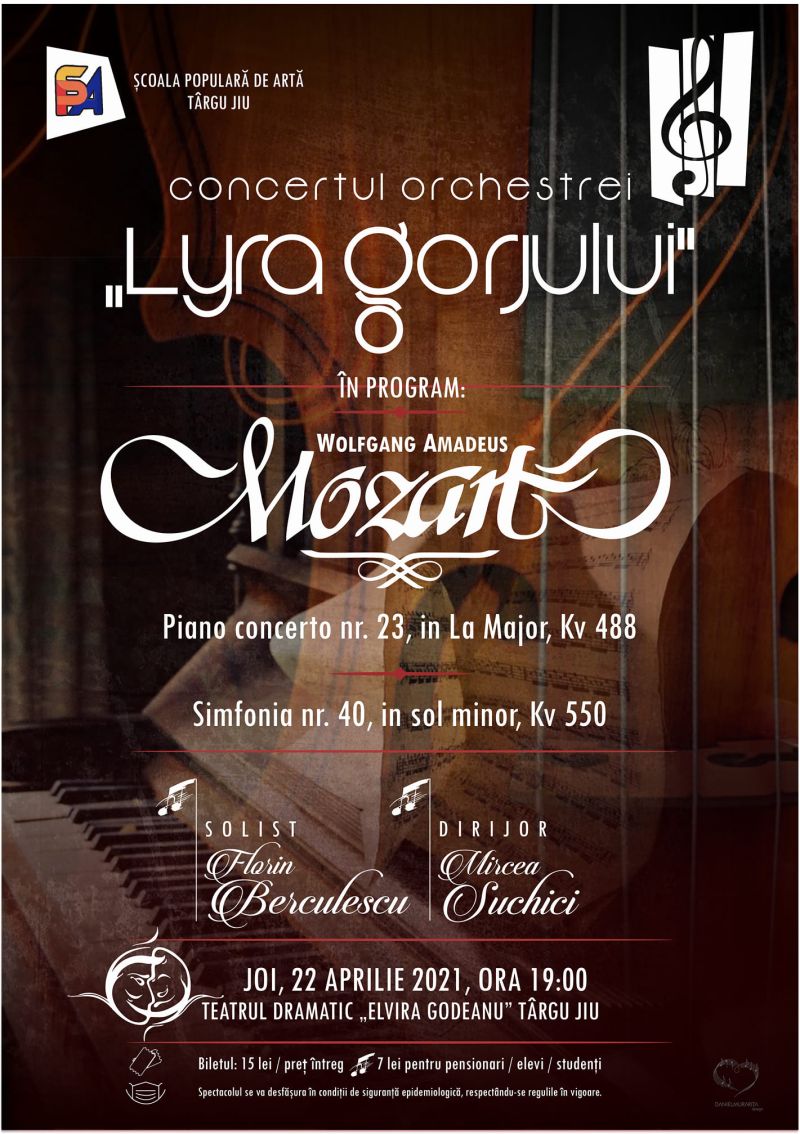 Evenimentul este organizat de Școala Populară de Arte ”Constantin Brâncuși” Târgu Jiu, cu sprijinul Consiliul Județean Gorj și al Teatrului Dramatic ”Elvira Godeanu” din Târgu Jiu. ”Sub bagheta dirijorală a violoncelistului Mircea Suchici, programul acestui eveniment cuprinde două lucrări celebre: Concertul pentru pian, nr.23 în La major, Kv. 488, scris în anul 1786, în perioada în care urma să aibă loc premiera operei ”Nunta lui Figaro”, și Simfonia nr. 40, în Sol minor, Kv.550, compusă în anul 1788, simfonie ce reflectă interesul său pentru mișcarea artistică cunoscută sub numele de Sturm und Drang (Furtună și stres), în care au fost prezentate emoții mai întunecate și mai puternice. Alături de Orchestra de cameră ”Lyra Gorjului” va evolua pianistul Florin Berculescu, profesor de pian în cadrul Liceului de Arte ”Constantin Brăiloiu” din Târgu Jiu. Prezentarea programului aparține doamnei prof. dr. Mihaela Sanda Popescu. Prețul unui bilet este de 15 lei, iar pentru elevi, studenți pensionari este de 7 lei. Accesul în sala de spectacole se va face în limita a 100 de locuri (50% din capacitatea sălii)”, au anunțat organizatorii.