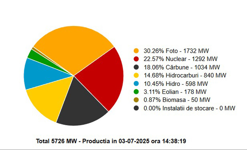 Pe primul loc, cu o cotă de peste 30% s-au situate fotovoltaice, urmate de energia nucleară, cu peste 22%, iar pe al treilea loc, cu o cotă de peste 18%, urmând hidrocarburile – 840 MW, energia hidro, cu o scădere semnificativă în această perioadă de secetă, având un aport în SEN de sub 600 MW. Pe ultimele locuri s-au situat ieri, după orele prânzului, eolienele și energia din biomasă.