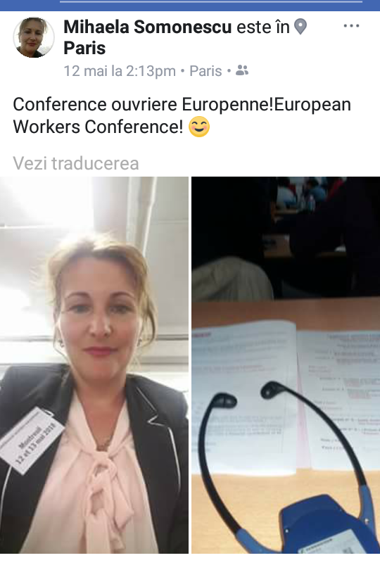 decât soțul ei. Ea era deja în Franța când am ajuns noi, și a venit, cu noi doar la întoarcere..’’, a spus Crețan, care o ținea una și bună că Mihaela Șomonescu nu a participat la nicio Conferință la Paris. “Nu a fost. V-am zis. Astea sunt intoxicări, în delegație au fost patru lideri de sindicat, nu doamna Șomonescu. Și apoi lucrările propriu-zise au avut loc sâmbătă și duminică, adică în perioada 12-13 mai’’, a completat Crețan, negând fotografiile cu cei doi soți de la Paris, ambii pozați în timpul conferinței. De altfel, soția liderului Șomonescu a arătat, în fotografii, și că a putut asculta spiciurile celor prezenți traduse în căști, iar pe ecusonul acesteia scria clar că evenimentul la care a fost prezentă s-a petrecut în perioada 12-13 mai. “Ce putea să spună doamna Șomănescu la această Conferință? Credeți că acolo intră toate rudele și neamurile? Exclus”, s-a întrebat retoric Crețan, întrebări pe care ni le punem și noi. Fotografiile îl contrazic pe Crețan, pătând evenimentul sindical care se dorea unul de înaltă ținută sindicală.