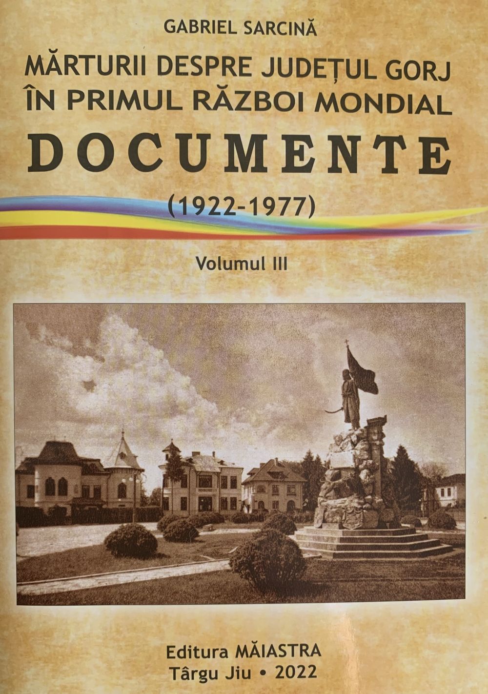 Recent a văzut lumina tiparului și cel de-al treilea volum al unei lucrări de referință pentru istoriografia Gorjului, scrisă cu acribie de distinsului prof. Gabriel Sarcină și intitulată ”Mărturii despre județul Gorj în Primul Război Mondial. Documente”. De menționat faptul că primele două volume cuprind documente identificate de către autor referitoare la Primul Război Mondial datate din perioadele 1916-1919 (vol. I), 1919 – 1921 (vol. II), iar cel de-al treilea volum, la care ne referim acum, fiind și ultimul din acest ciclu, cuprinde documente datate în perioada 1922-1977.