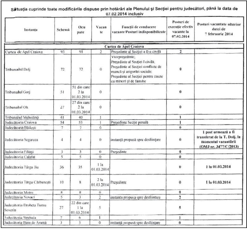 Potrivit listelor cu posturi vacante publicate pe site-ul CSM, la Tribunalul Gorj, din cele 51 de posturi existente, 49 sunt ocupate, iar celelalte două urmează a se ocupa de la data de 1 martie 2014. La Judecătoria Târgu-Jiu sunt ocupate 35 dintre cele 36 de posturi existente; un singur post va fi vacant de la data de 1 martie 2014. Pentru magistraţii care doresc să-şi desfăşoare activitatea la Judecătoria Târgu-Cărbuneşti este vacantă funcţia de preşedinte; la aceeaşi instanţă se va mai vacanta un post începând cu data de 1 martie 2014. La Judecătoria Motru nu există niciun post vacant, iar Judecătoria Novaci este propusă spre desfiinţare.