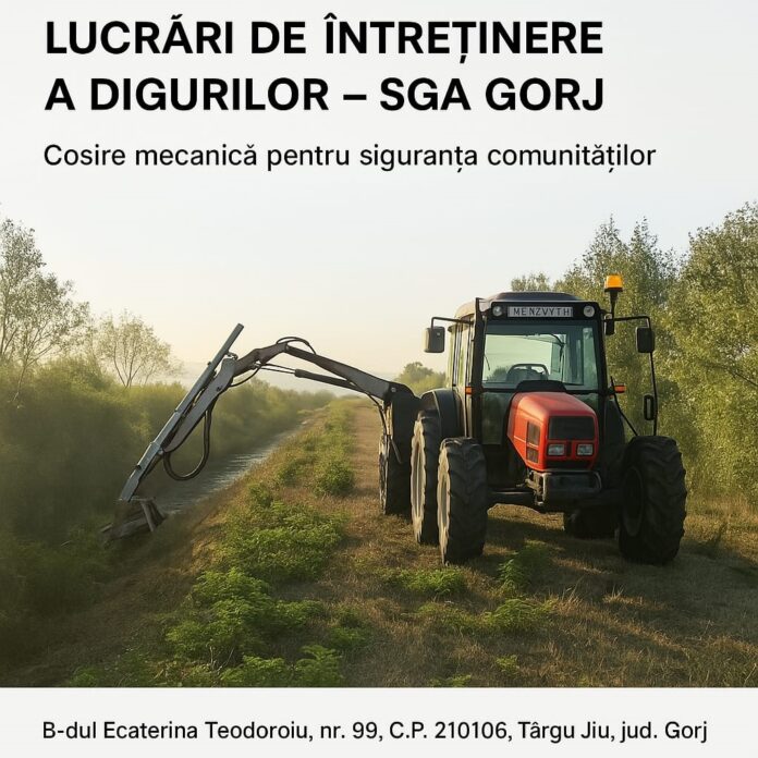 Sistemul de Gospodărire a Apelor Gorj (Apele Române Jiu) continuă lucrările de cosire mecanică a vegetației de pe digurile aflate în administrare, conform Programului de Întreținere și Reparații Curente 2025. Zonele vizate sunt râurile Amaradia – Târgu Jiu (]n zonele Drăguțești și Romanești și Jiu – Roșia-Vlăduleni și Plopșoru (Sărdănești) și canalul Beterega – aval și amonte pod DN Tg. Jiu – Țânțăreni