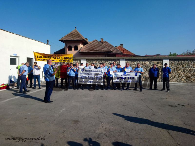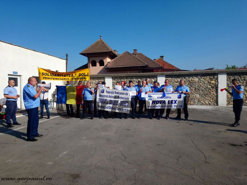 Circa 20 de membri ai Sindicatului Nova Lex, totodată salariați ai Penitenciarului Târgu- Jiu, au pichetat, ieri, în curtea unității ca urmare a condițiilor precare de lucru, neplata a aproximativ un milion de ore suplimentare prestate și pentru eliminarea abuzurilor instituite asupra pensionarilor proveniți din acest sistem. Proteste similare au fost, ieri, și la unitățile de detenție din Bacău, Iași și Târgu Ocna. Pe lângă revendicările strigate, salariații Penitenciarului Târgu- Jiu au cerut și demisia ministrului Justiției, Tudorel Toader. ”Federația Sindicatelor din Administrația Națională a Penitenciarelor a înaintat un calendar de protest. Nu mai târziu de data de 10 august am avut o primă formă de protest, aceea a grevei japoneze, în urma căreia nu s-a întâmplat nimic. Revendicările noastre au rămas undeva neonorate. Ca și revendicări, acestea sunt: condiții de lucru mai bune, cerem plata orelor suplimentare care în continuare sunt un milion de ore neplătite. De asemenea, avem revendicarea cu privire la statutul polițistului de penitenciare, eliminarea discriminărilor salariale; cerem domnului ministru aplicarea Legii 153 și pentru sistemul de ordine publică și siguranță națională. Totodată, cerem eliminarea abuzurilor asupra pensionarilor și să ne includă și pe noi în negocieri pentru că la o dată anterioară acest lucru ne-a fost refuzat pe motiv că nu am avea reprezentativitate. De asemenea, îi cerem ministrului Justiției, Tudorel Toader, să plătească orele suplimentare curente pentru că există un termen de 60 de zile în care acestea trebuie să fie achitate. Sperăm ca în urma revendicărilor să obținem ceva. Dacă nu vom obține, pe data de 3 octombrie va urma un miting de protest în fața Ministerului Justiției și, implicit, a Administrației Naționale a Penitenciarelor, iar dacă în urma acestui miting nu se va rezolva nimic cu privire la revendicările noastre, vom merge până la refuzul intrării în serviciu. De la Penitenciarul Târgu- Jiu, protestează în jur de 20 de salariați. Este adevărat faptul că în anul 2017 au fost foarte multe pensionări în acest sistem, dar nu suntem noi vinovați că s-au pensionat oamenii. Este dreptul lor. (…) Prin acordul colectiv de muncă, avem 5 ore pe lună plătite pentru desfășurarea activităților sindicatelor, acest acord este semnat de ministrul Tudorel Toader”, a declarat Ion Tătaru, președintele Sindicatului Nova Lex Târgu-Jiu.