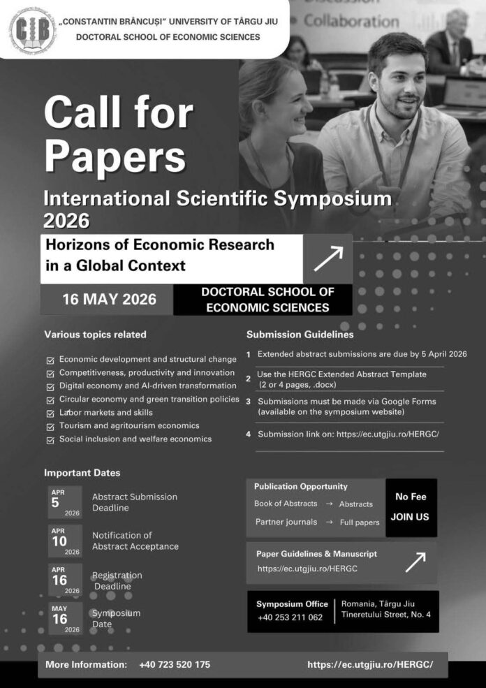 Universitatea „Constantin Brâncuși” din Târgu Jiu, prin Școala Doctorală de Științe Economice, organizează pe 16 mai 2026 prima ediție a International Scientific Symposium „Horizons of Economic Research in a Global Context” (HERGC). Evenimentul va avea un format hibrid, desfășurându-se atât la Târgu Jiu, cât și online.