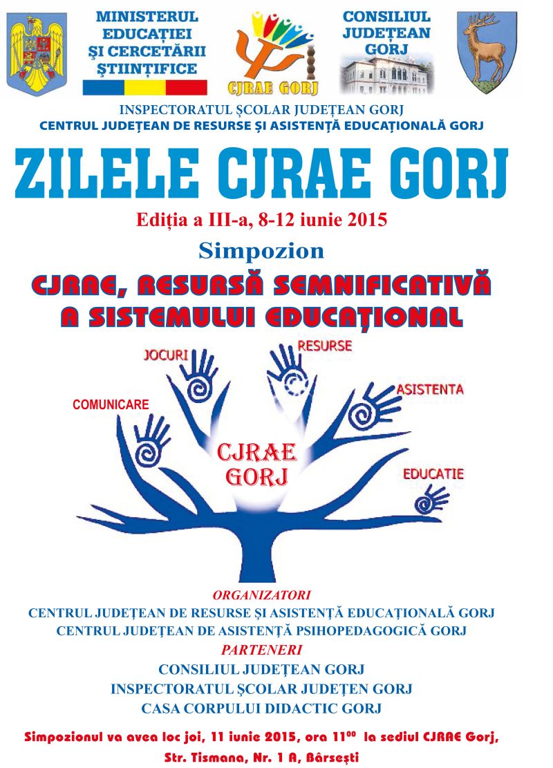 Centrul Judeţean de Resurse şi Asistenţă Educaţională (CJRAE) Gorj şi Centrul Judeţean de Asistenţă Psihopedagogică (CJAP) Gorj vor organiza în cursul acestei zile o nouă ediţie a Simpozionului Judeţean “C.J.R.A.E. – Resursă Semnificativă a Sistemului Educaţional”.