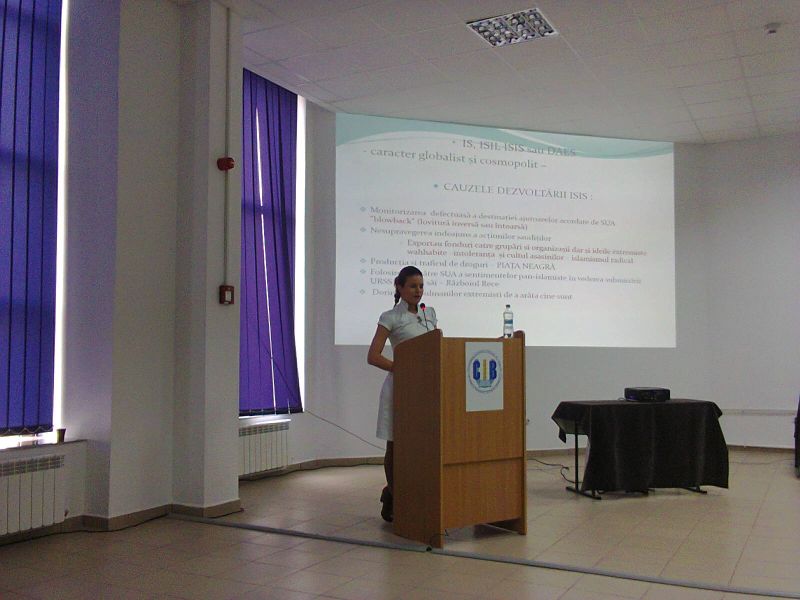 Din lista comunicărilor interesante și pline de conținut prezentate cu acest prilej, amintim pe următorelele: «Migrația și terorismul. Criza de identitate în context european. Europa în criză de identitate?» (Prof. univ. dr. Adrian Gorun), «Toleranța și intoleranța religioasă în lumea contemporană» (Preot Conf. univ. dr. Ioan Sorin Bora – Fotografie0453Facultatea de Teologie Ortodoxă, Universitatea din Craiova), «Tendințe actuale ale migrației globale» (Prof. univ. dr. Dumitru Otovescu, Universitatea din Craiova), «Împărțirea zonelor de influență mondială versus migrația internațională» (cercet. dr. Costina Ştefănescu ), «Impactul fenomenului migrației la nivelul României» (Ionuţ Munteanu, Şef Birou emigrări), «Libertatea de circulație în Uniunea Europeană și securitatea frontierelor» (dr. Alexandra Porumbescu, Universit. din Craiova), «Prevenirea și combaterea terorismului» (col. rez. Alin Caragea), «Lupta împotriva terorismului din perspectivă europeană» (conf. univ. dr. Ina Tomescu), «Terorismul în teatrele de operații» (colonel. Dan Ionescu – cdt. Batalionului 26 Infanterie «Scorpionii roşii» Craiova) și «Statul Iisis» (cercet. IPPASE -UCB, Valentin Popa), ca și prezentarea cărții: «Migrația românilor în Germania» (autor dr. Alexandra Porumbescu, Universit. din Craiova).