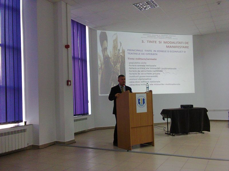 În intervenția sa, d-l colonel în rez. Alin Caragea atrăgea atenția asupra faptului că “nu putem vorbi de combaterea fenomenului terorismului, fără a explica ce înseamnă acesta și care sunt formele de manifestare, mai ales că globalizarea terorismului este o realitate de necontestat care presupune prevenirea, protecția, urmărirea și răspunsul necesar pentru reducerea consecințelor sale”. Prin cuvinte bine articulate și susținute prin argumente convingătoare, dl. colonel Dan Ionescu, comandantul Batalionului 26 Infanterie «Scorpionii roşii» din Craiova a apreciat că “nu pacea este starea naturală a omenirii, ci războiul (sic??!!), mai ales dacă vorbim de amenințările «hibride» în teatrele de operații din lume! De aceea, modalitățile de combatere a terorismului impun existența uni cadru legislativ de acțiune, preocuparea pentru informarea și educarea populației prin mijloace naționale de avertizare și de supraveghere”.