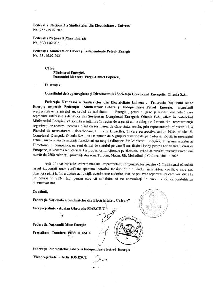 Solicităm, în situația confirmării celor sesizate, demiterea sau demisia de onoare a celor implicați în sabotarea interesului național și periclitarea stabilității Sistemului Energetic Național, prin măsurile ce doresc a le impune, cu scopul vădit de a facilita anumite grupuri de interese”, se arată într-o adresă semnată de Federația Națională Mine Energie, Federația „Univers” și Federația „Petrol-Energie”.