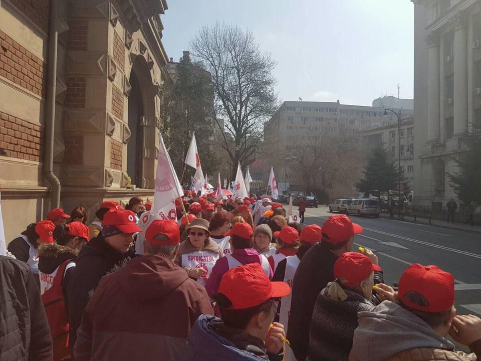 Câteva sute de membri ai Federaţiei SANITAS din întreaga ţară au protestat, joi, în faţa Ministerului Muncii, aceştia fiind nemulţumiţi de salarizarea personalului şi de condiţiile de muncă. Sindicaliştii sunt dispuşi să continue protestele, ajungându-se până la greva generală, dacă revendicările lor nu sunt soluţionate corespunzător.