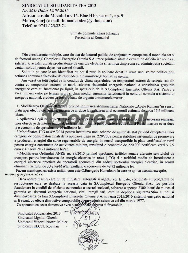 Mai multe măsuri de ordin legislativ care ar putea salva Complexul Energetic Oltenia, companie ce se vede obligată să disponibilizeze 2000 de angajați, au fost cuprinse într-un memoriu redactat de patru sindicate care fac parte din Federația Univers. Sindicaliștii au transmis documentul parlamentarilor din Oltenia, ministrului Energiei, premierului și chiar președintelui țării, așteptând astfel o reacție pozitivă de la destinatari.