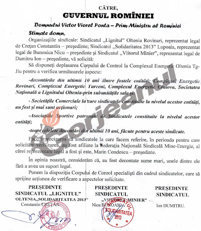 Trei organizaţii sindicale din Complexul Energetic Oltenia au solicitat, ieri, în scris premierului Victor Ponta să-şi trimită la Gorj Corpul de Control pentru a verifica decontările din ultimul deceniu ale fostelor entităţi Complexul Energetic Rovinari, Complexul Energetic Turceni, Complexul Energetic Craiova şi Societatea Naţională a Lignitului Oltenia prin subunităţile sale. Sindicaliştii cer, de asemenea, verificarea societăţilor comerciale la care sindicatele constituite la nivelul acestor entităţi au fost şi mai sunt acţionari, dar şi asociaţiile sportive patronate de aceleaşi sindicate. Solicitanţii indică în document că sindicatele în cauză au fost afiliate FNME, conduse încă de Marin Condescu.