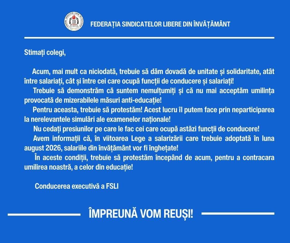 Federația Sindicatelor Libere din Învățământ (FSLI) a transmis că, potrivit informațiilor deținute, salariile din învățământ ar putea fi înghețate în viitoarea Lege a salarizării, care urmează să fie adoptată în august 2026. În semn de protest, federația recomandă cadrelor didactice să boicoteze simulările examenelor naționale, pe care le consideră „nerelevante”.