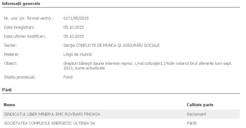 Sindicatul Liber Minerul Rovinari Pinoasa, condus de Marin Golea, angajatul administraţiei Complexului Energetic Oltenia, a deschis, săptămâna trecută, un proces împotriva CEO, cerând companiei daune interese reprezentând contravaloarea cotizaţiei de 1,1% din salariul brut aferente lunii septembrie a anului 2013. Se cer astfel, tardiv, de către structura sindicală banii în cauză, cu precizarea însă ca sumele să fie actualizate, asta în condiţiile în care Golea a fost promovat şef al juriştilor de la Mentenanţă-Rovinari, fiind angajatul administraţiei pe care o cheamă acum la bară. Mai mult, Golea porneşte acest demers după ce declara cu doi ani în urmă că oprirea cotizaţiei de către CEO pe care o cere acum, la proces, nu reprezenta pentru el decât ceva aproape insignifiant.